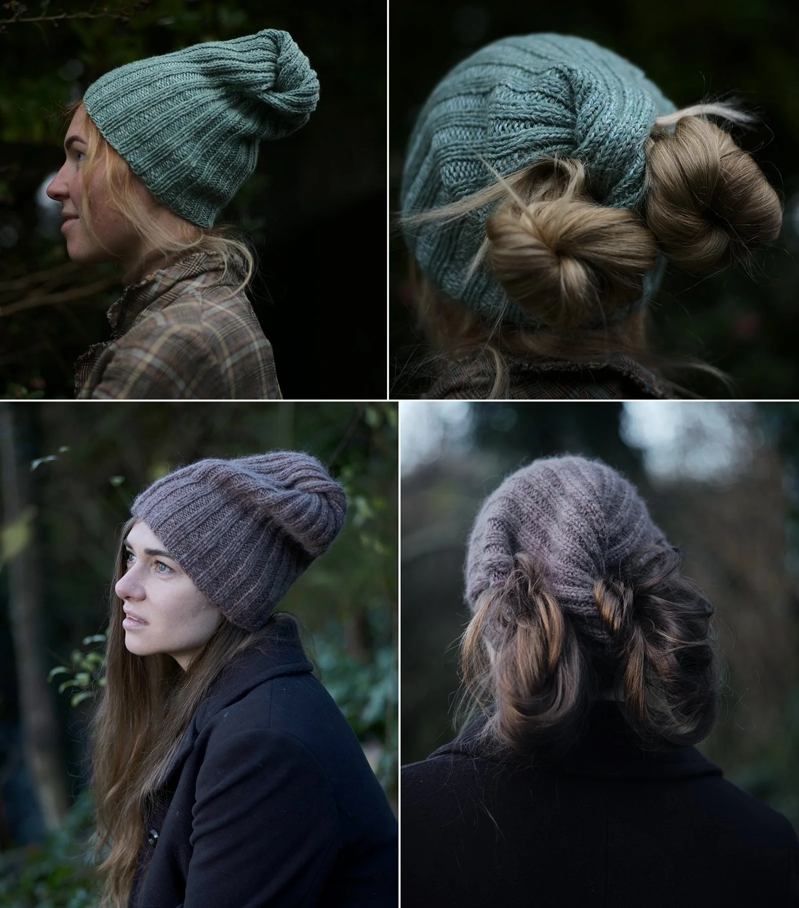 Let’s say that like me, you love to wear your hair half-up, with a beret or clip at the crown of your head. Or you decide to wear something like ‘Heidi’ braids, a French twist, a ballerina bun - you get the idea. Normally, if we try to wear a beanie or beret over something like this, the hat will either mess up the style, or will look super weird and distorted. The construction of the Top-Twist Beanie, on the other hand, will accommodate any of these hairstyles. The photo on the top left shows the hat being worn in this mode: In that photo, the model’s thick, curly hair is arranged in a high bun, which is completely engulfed by the hat’s crown.